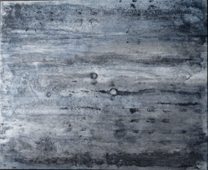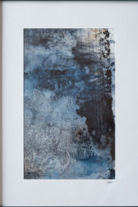 Mireille Gobrecht et Anne-Marie Vannier présentent aujourd’hui des petits et grands formats dans une unité chromatique de bleu, noir, brou de noix…Leurs univers habités d’empreintes, de signes, de mots se répondent.
